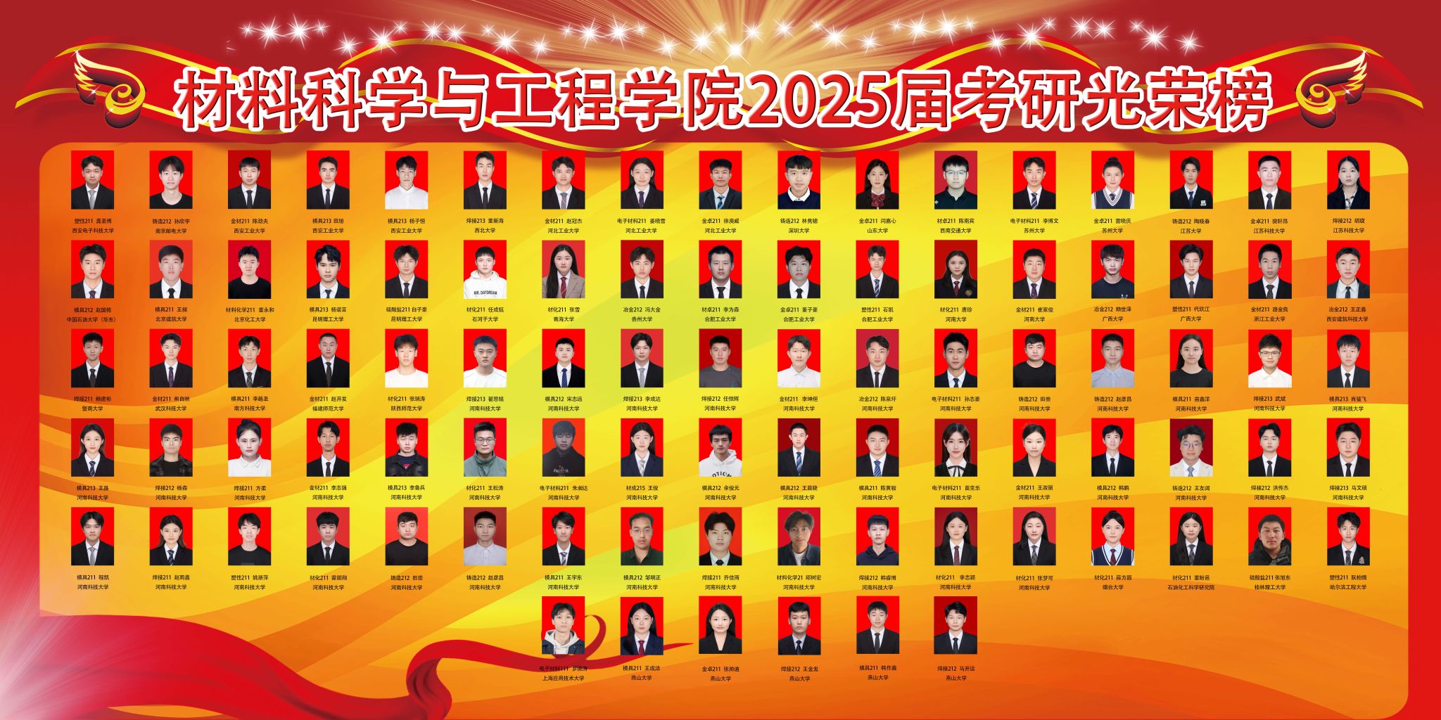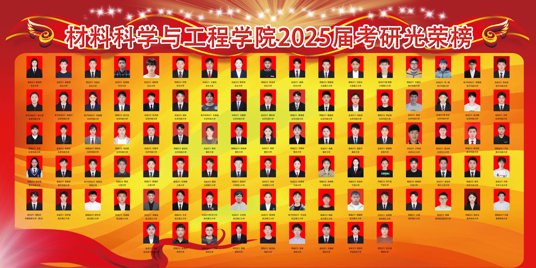 2025届应届毕业生559人,考取研究生287人,总体升学率51.34%。材料学院考研学子整体成绩斐然,多个班级升学率突破70%,彰显了学院卓越的育人成效。其中,金属材料工程(卓越)211班以76.7%的考研升学率位居全院首位;材料成型及控制工程专业焊接211班的考研升学率达71.4%,凸显出专业的强劲实力;金属材料工程专业考研升学率为70%,续写辉煌;材料化学211班的考研升学率也高达67.6%,充分彰显了学科优势。