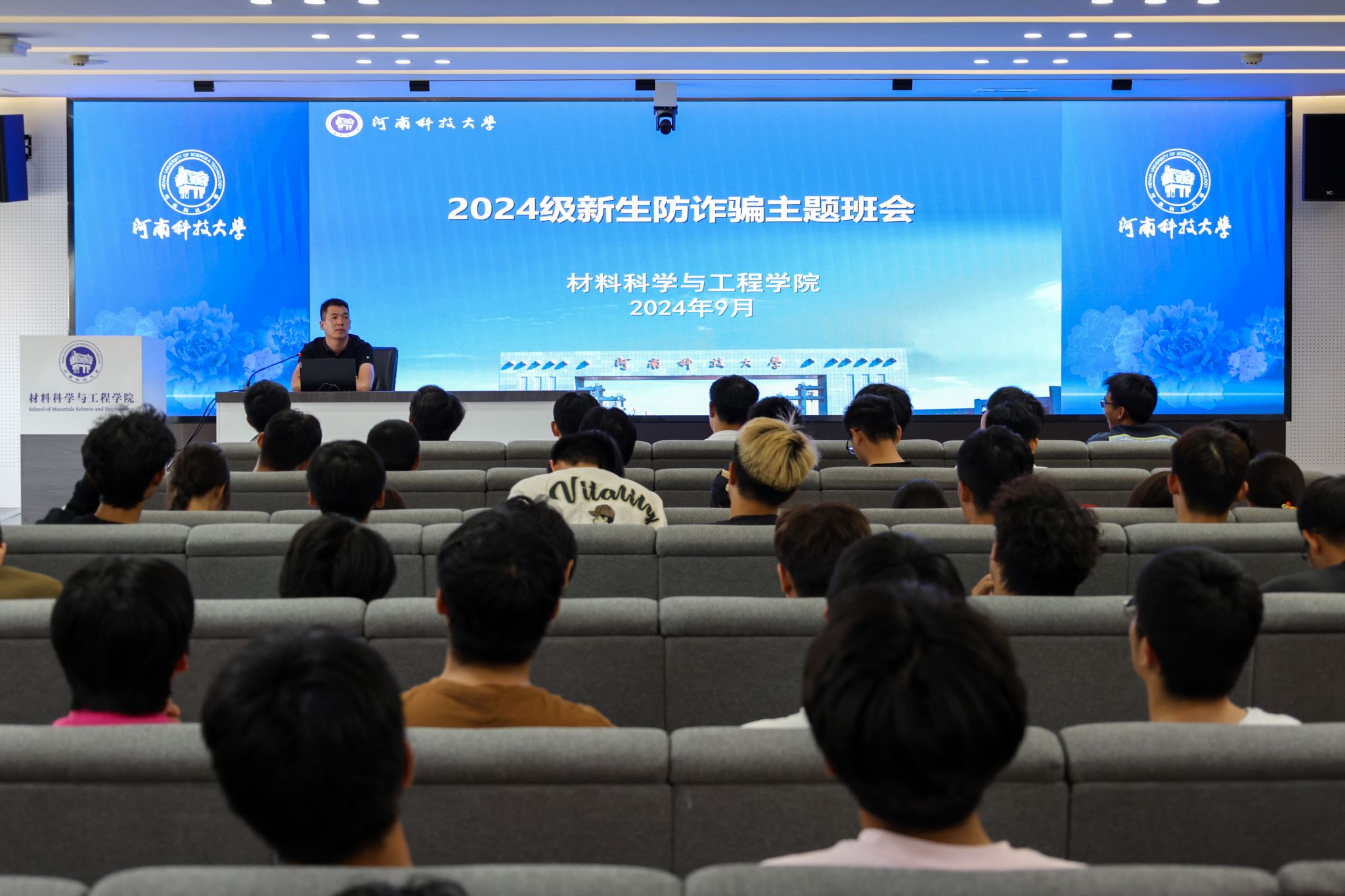展开2024级新生防诈骗主题班会。防诈骗由辅导员姚占杨主持。