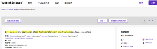 此外,潘昆明副教授参与的另一篇论文《Development and application of self-healing materials in smart batteries and supercapacitors》发表在中科院一区Top期刊《Chemical Engineering Journal》(影响因子为13.273),同时于7月12日入选Essential Science Indicators(ESI)高被引和热点论文。